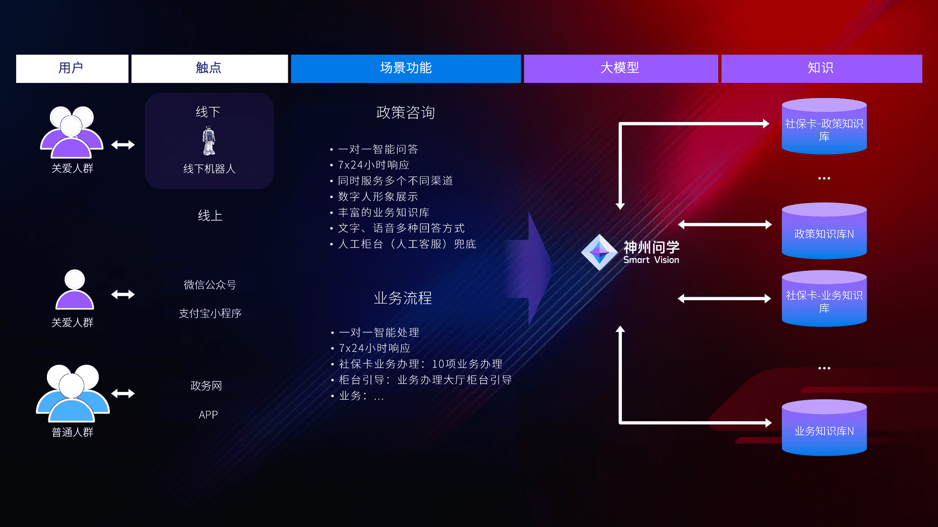 • 利用大语言模型+RAG技术,,,,支持多轮对话,,,可识别多种同义词、、、、近义词,,,精准理解关爱人群语义快速输出结果。。